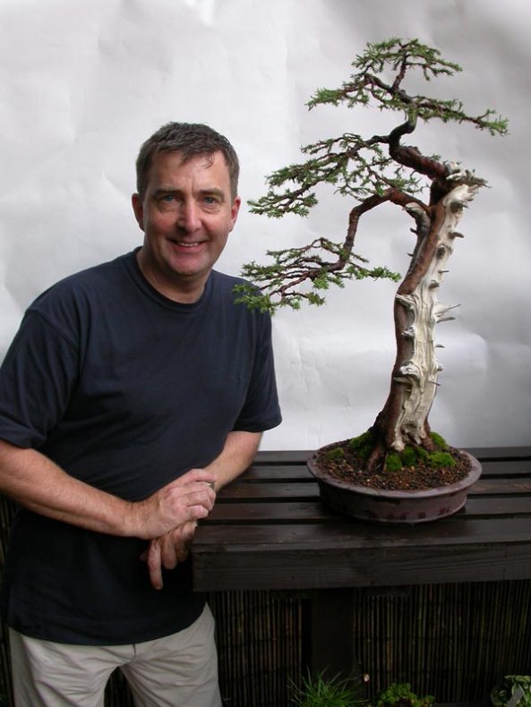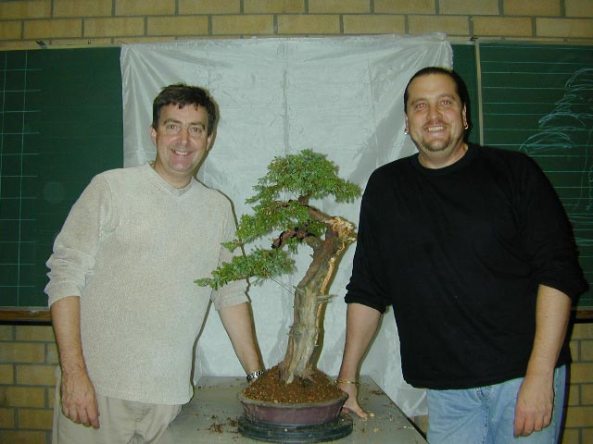 The tree at the end of the Belgium Bonsai Associations demonstration. Hans van Meer helped with the wiring and repotting into an Ian Baillie pot. The Audience were quite surprised that I worked on the top of the tree and the roots at the same time. The tree was very healthy and having worked it for so long I knew the exact condition of the roots and just how much I could remove.