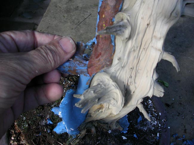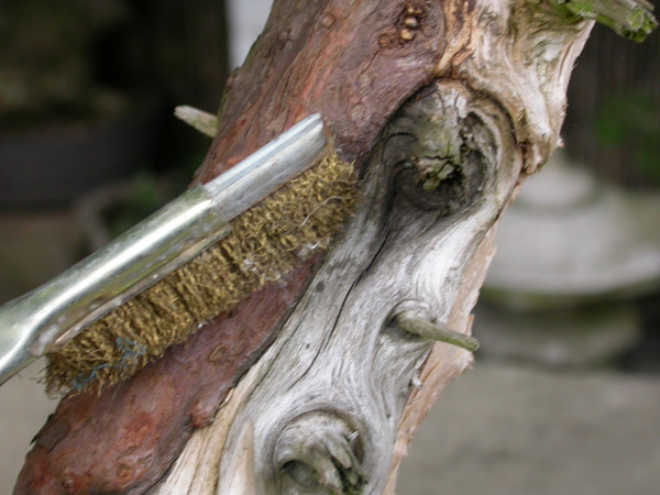 The life lines are very powerful; this gives a great feeling of age. Getting the deadwood to be ‘ancient’ alongside these lifelines is the objective. All areas of the tree that are to be ‘aged’ are left exposed. All other areas must be protected as the process is very aggressive. Here I use a brass wire brush to removed flaky bark so that I can ‘paint’ a rubberised solution to protect the live from damage.