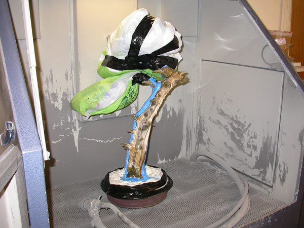 Inside the blasting unit. Very fine sand is used at a pressure of 110 psi this gives the best balance between removing the softer wood and keeping the detail. A tree of this size usually takes about an hour to complete in the Blast box.