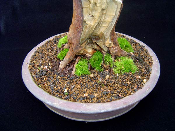 The nebari is finally checked and improved by removing small roots that cross the major roots. The surface of the soil is dressed with a mixture of ‘Fujigrit’ and Acadama. Moss is placed to add colour and interest.