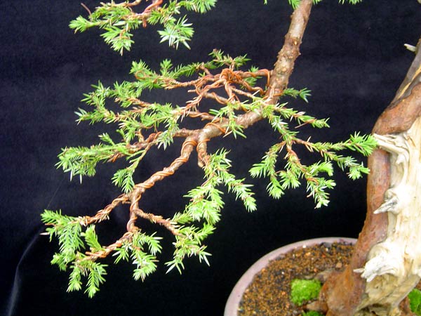 The foliage had been let to grow long every three years then cut back hard. All the time the emphasis on a compact crown and good branch structure, San José Juniper is notorious for only having foliage at the ends of branches because no light has penetrated the tree close to the trunk. The tree was also lifted from the field and the Nebari checked and adjusted if required