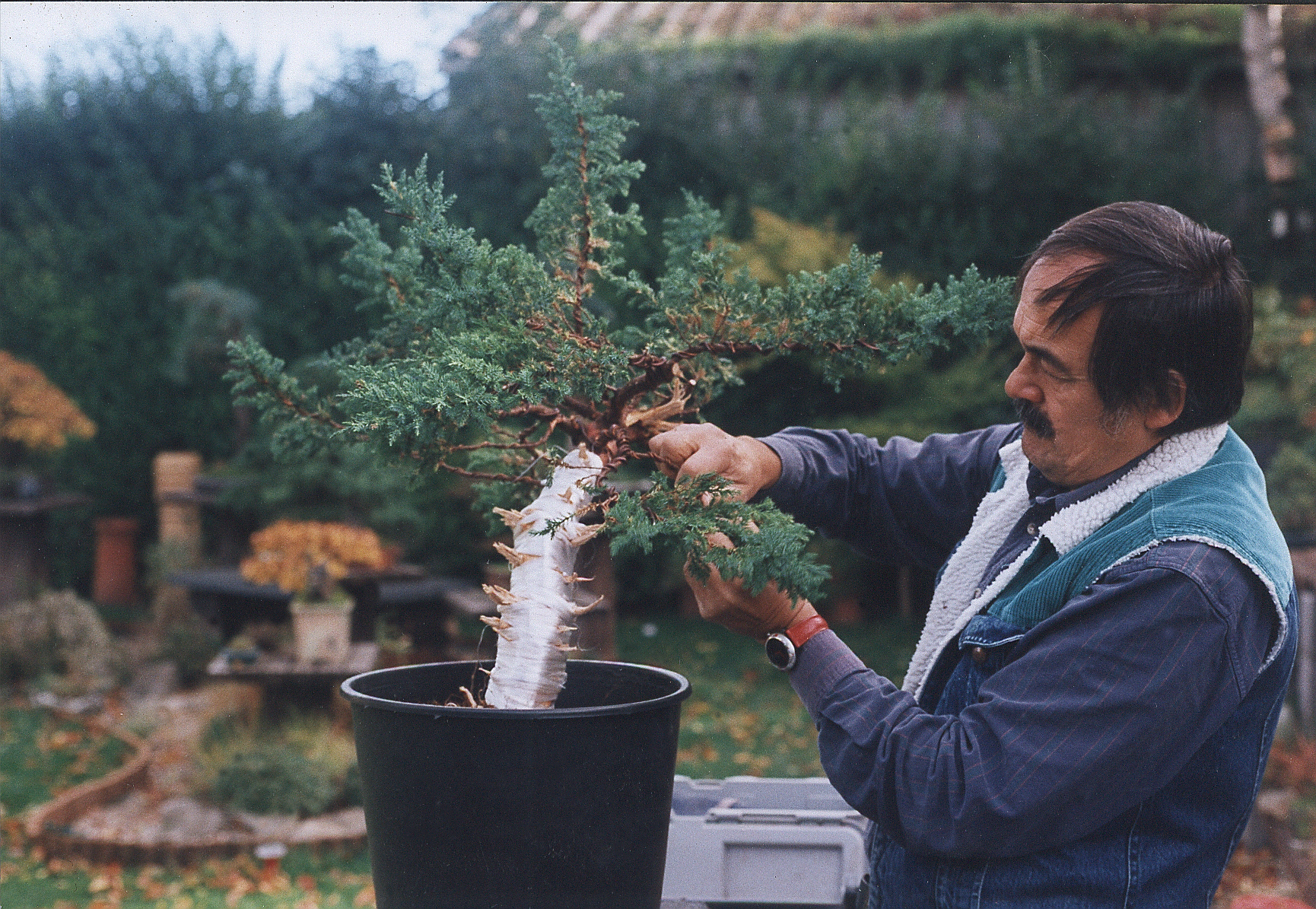 After seven years growing in my field the tree was transferred to this plastic pot. The soil mix was very open and the tree was heavily fertilised.