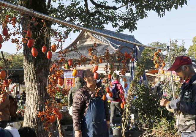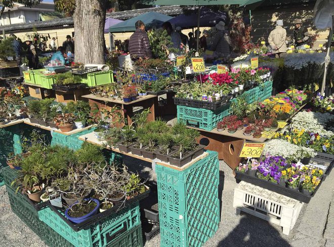 This morning a few of us visited a large flea market at the Toji Temple, which is near our hotel in Kyoto. We arrived early to avoid crowds, but were met with hoards of people including many foreigners looking and buying. Near the main entrance there was a large area with vendors selling flowers, plants, dried fruit and even bonsai.