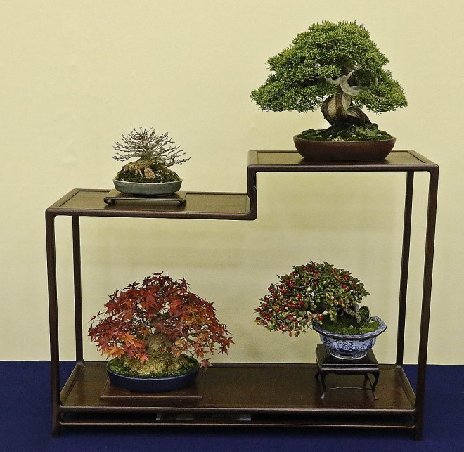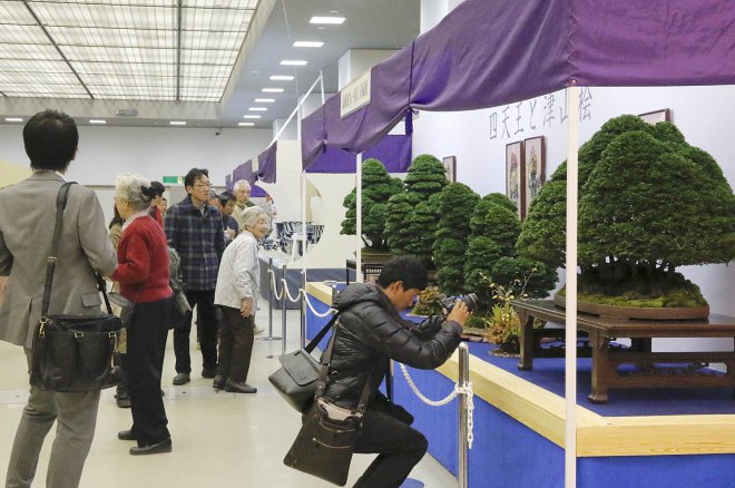 The 34th Nippon Taikan Bonsai Exhibition opened this morning after the traditional ribbon cutting ceremony. The show was well attended and the crowds continued to increase until mid-afternoon. Although anyone could take photos it was a bit difficult with people getting in the way. Also the yellow and purple backgrounds did not help with the white balance and different lighting.