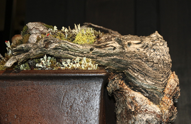 The inaugural Artisans Cup Exhibition was held at the Portland Art Museum on September 25-27, 2015. The well attended and dramatic show of 72 exhibits featured nearly 100 individual trees, if all the shohin and three point bonsai are counted. The black unique metal and wood individual tables were professionally designed and installed by a fabricator. The exhibition gallery was darkened and was only lighted by two small lights adjusted by a professional photographer to highlight the focal point of each bonsai display.