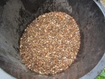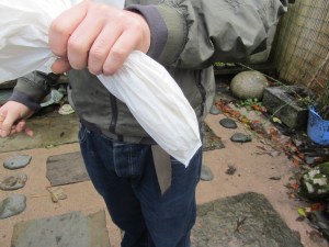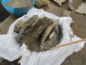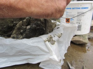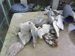 I have chosen to make a miniature crevice garden, I have used limestone and a bonsai pot. After a couple of attempts the stones simply were not secure, as I need ‘height’ and gaps between for planting. The only solution was to bind them together with waterproof cement, but still retaining enough room in the pot for compost and drainage. I made an ‘icing bag’ out of plastic shopping bag to help push the cement into the cracks, some gaps in the stone were left for drainage.