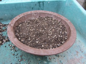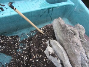 - Fill with soil mixture (John Innes No.2 with crushed Pumice) using a chop stick to force soil into the crevices.