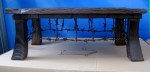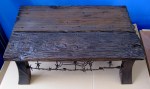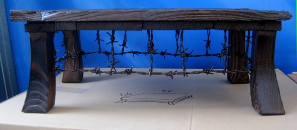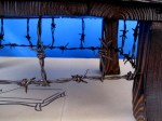 While I wait for a root stand of quality to present itself, I have decided to create something unusual. I have displayed the tree before on the wooded stand but felt it lacked something. A brainstorming session with Andy from Stone Monkey Ceramics and referring to the unusual tables shown on this blog and here you have the outcome. The twisted barbed wire was ‘found’ on the banks of the Thames near the Olympic Canoe sprit venue. No cutting needed it just fits!