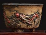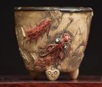 I asked Thor Holvila to make a pot for the tree, I was looking for a different approach … This from Thor “I call this design Nidhögg since its depicting the dragon snake in Norse mythology that guards the world tree Yggdrasil. It’s carved by hand from one piece of granite grey Danish clay. Thor Holvila‘s attention to detail is wonderful, unseen are the faces of of Nordic characters with the eyes being the wire holes, each face different, and the feet are characteristic of of the carvings on Viking longboats.