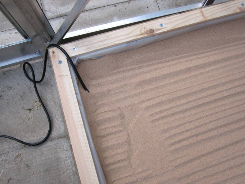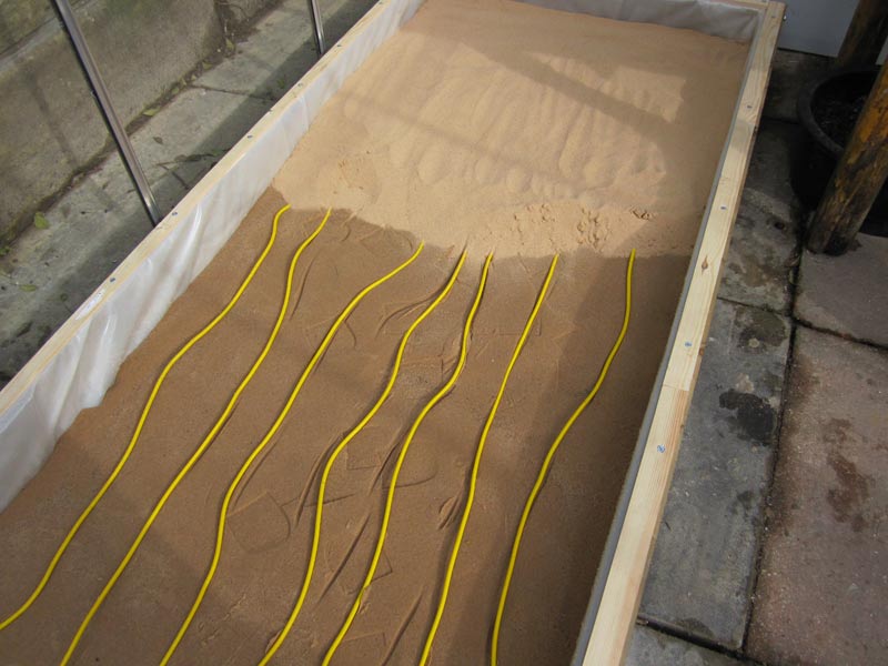 The heating cable (80ft long) is placed as shown and covered with a further 2” of Sand.