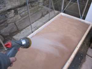 12 bags of Kiln Dried Sand are used to line the base of the frame, 2” deep. This Sand never ‘hardens’ and is a joy to work with. ‘Builders’ sand is not suitable. The Sand is then saturated with water